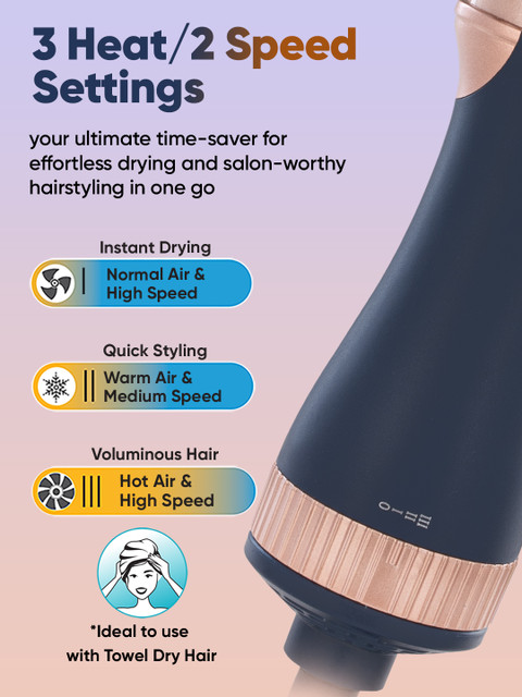 | How-to-Use | Prior to plugging in, check the voltage on the rating label to ensure it corresponds with your household mains voltage.The hair dryer brush is equipped with 3 heat and 2 speed settings, which are controlled by a rotary button.Let your hair be partially dry and start sectioning it.Turn the appliance on.Take a small section of hair and place the brush a few inches away from the scalp.Slowly glide the brush downward.Continue to repeat the process until your hair is dry and perfectly brushed. |