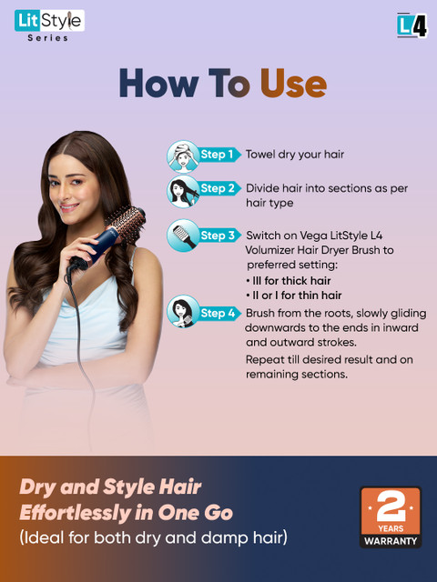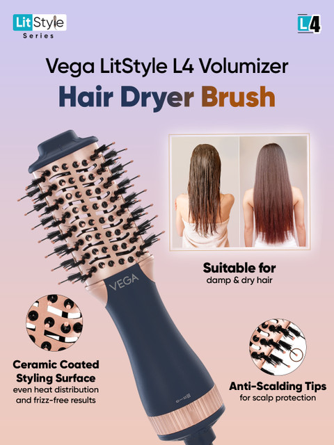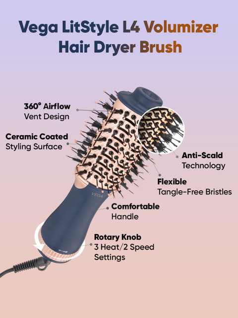 | Special Features | ALL IN ONE COMPACT HAIR DRYER BRUSH: The hot air brush is the best blow dryer brush to dry and style hair in one go with just one appliance. Enjoy salon-like blowouts on the go and at home by saving half the time with the hair blow dry brush.DRY &, STYLE HAIR IN HALF THE TIME: The compact hot hair brush can dry and style your hair in half the time. You no longer need to use a hair dryer and a hairbrush together that takes forever to dry and style hair.CERAMIC STYLING SURFACE: The hair volumizer brush comes with ceramic styling surface that delivers even heat distribution for the best results to all types of hair. You can flaunt smooth and frizz-free hair blowouts anytime, anywhere.MULTIPLE HEAT/SPEED SETTINGS: The hair brush for blow drying is perfect for all hair types as it comes with 3 Heat and 2 Speed Settings that deliver maximum versatility to dry and style hair. Use the hairdryer for womens and mens on thin hair, medium hair, thick hair, curly hair, wavy hair, straight hair and more.FLEXIBLE TANGLE-FREE BRISTLES: Experience minimum hair tugging and pulling while blow drying your hair with the flexible and tangle-free bristles of the blow dryer brush. The hair styling brush also features massage ball tips for smooth and massaging effect on the scalp.ANTI-SCALDING TIPS: The blow dry brush for hair styling features anti-scalding tips for scalp protection every time you dry or style your hair in your choicest ways. This also ensures you experience safe and hassle-free use without harming the scalp and hair.TRAVEL-FRIENDLY: The Vega compact hair dryer brush and hair volumizer is small in size and light in weight, making it the perfect travel partner to carry in your handbag, luggage and more.EASY TO USE: The air brush for hair is user-friendly, which makes it ideal to be used by both beginners and hairstyling enthusiasts for quick and effortless hair drying and styling. |