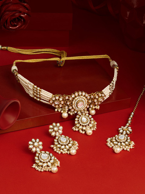 Gold-plated choker necklace has white kundan stone-studded and white beaded details