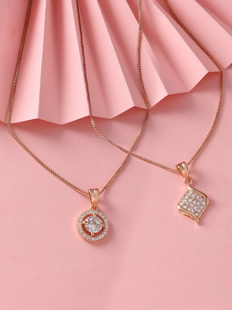 The necklace set looks sleek with a rose‑gold finish and two pendant styles: one circular with a large center stone surrounded by smaller diamonds, and one square pendant packed with tiny sparkling stones. The chain is thin and delicate, giving a classy everyday vibe. The craftsmanship appears good, with shiny metal and well‑set gems that catch the light nicely.